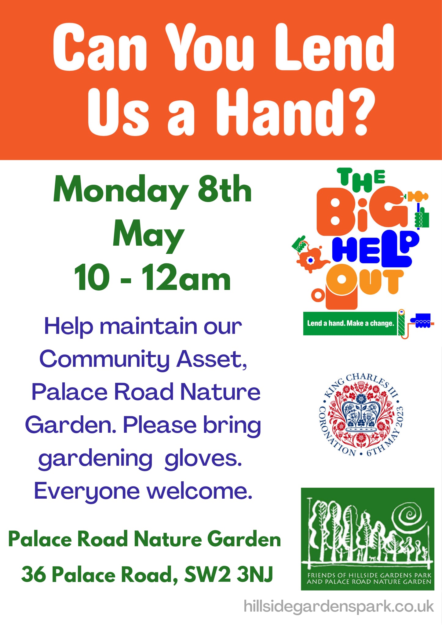 At our Friends meeting in January 2023 at The Crown & Sceptre Pub, former Chair and current trustee Tony Emerson proposed the Big Help Out as a good opportunity to get volunteers out and working in the parks. As a charity we are set up to look after, represent and organise activities for people to participate in. Such an event would present an opportunity to engage with new volunteers as it would get good publicity being a national campaign as promoted and encouraged by King Charles III.