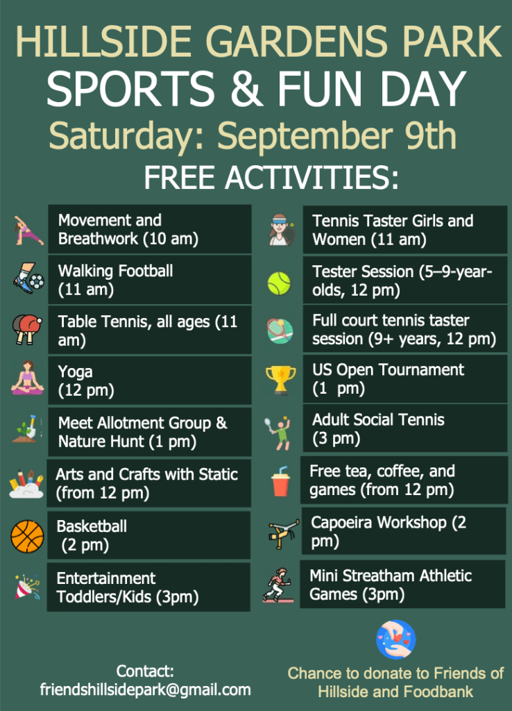 This Saturday (9th September), we have our annual Sports and Fun Day. Find the final programme below. This year, we tried to incorporate more fun games, not “just” sports. We will have entertainers for the little ones (3 p.m.), arts and crafts (12 p.m.), a giant snakes and ladders game, and a nature hunt with the allotment group. But of course, we will also have tennis, basketball, football, table tennis – all the things we love to do in our park. And for the first time, we will have a capoeira workshop at 2 p.m., a combination of dance and martial arts. All of these activities are free. Speaking of free: We will have coffee, tea, cake and more from 12 p.m. If you want to support our local footbank or the Friends of Hillside, you can make a donation there. And finally, all day long, you can meet tons of lovely people in the park.