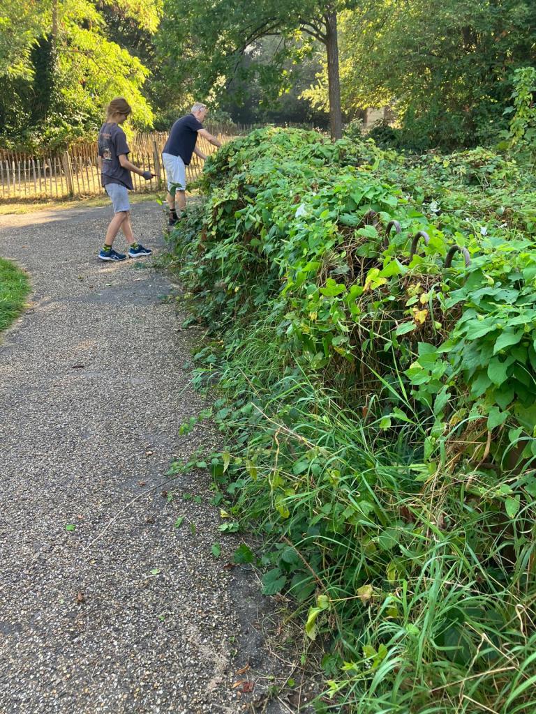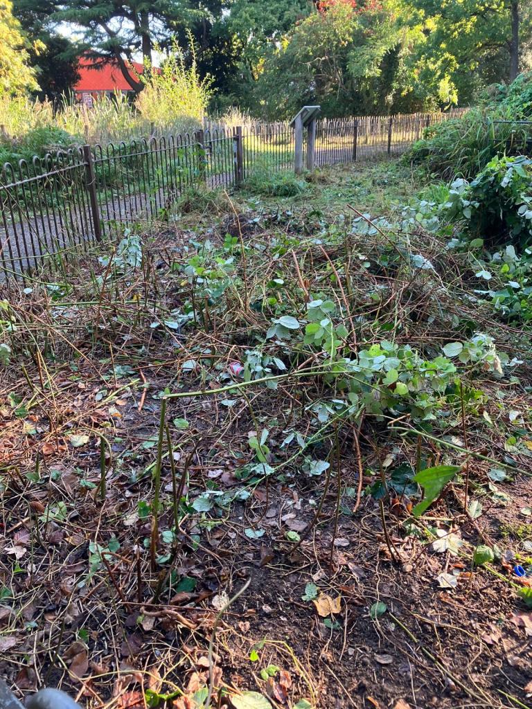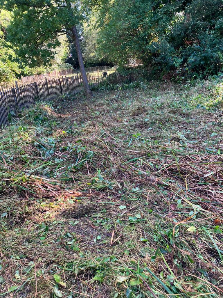 Here are pictures from September 2023, when clearance work first started as the Gardening Group, led by Tom Stanbury, worked through Saturday mornings in the autumn. In the middle and on the right, you can see how it looked a couple of weeks later. We now have hedgerow trees planted along some of this section.