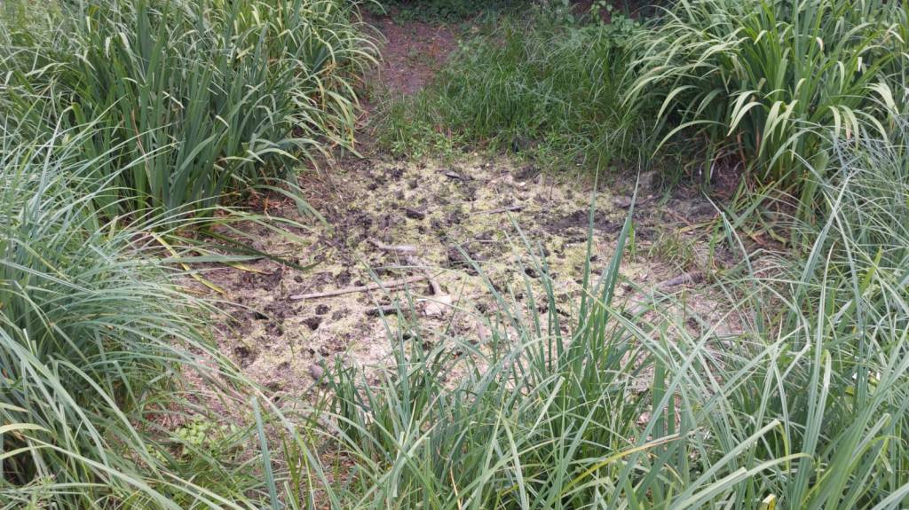 Below, you see pictures of the pond at the beginning of 2025, the starting point of the project, and our motivation to improve it. One of the biggest problems is that the pond had very little water. The failed pond lining is the fundamental issue in retaining the rainfall that does come. Hence, Nick applied for funding for the restoration work.